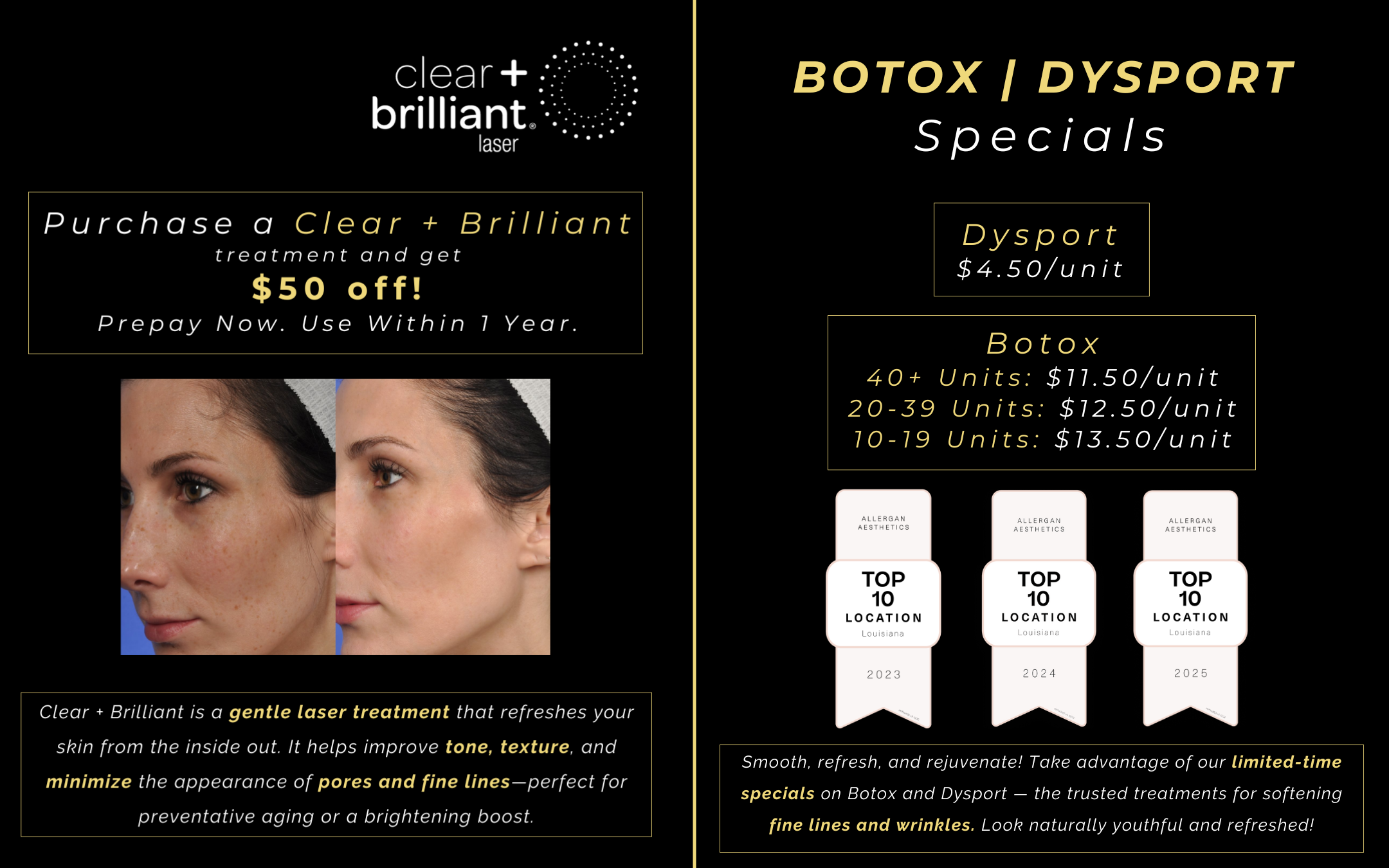 Check out these attractive specials offered at Dr. Boudreaux and Dr. Claiborne's high-end practice, located about 40 minutes north of New Orleans.